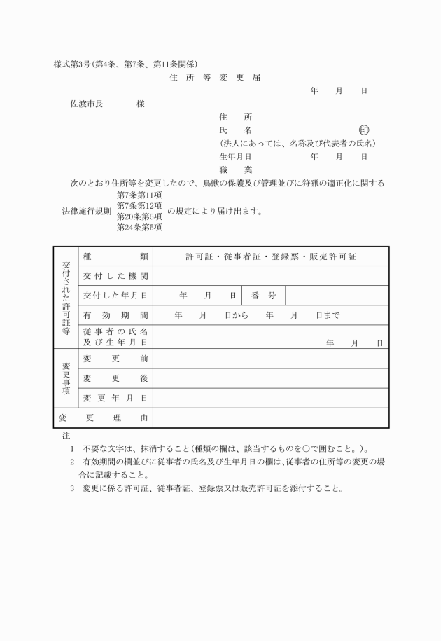 第4条 省令第7条第11項の規定による許可証に係る住所等の変更及び同条第12項の規定による従事者証に係る住所等の変更の届出は、住所等変更届(様式第3号)により行わなければならない。