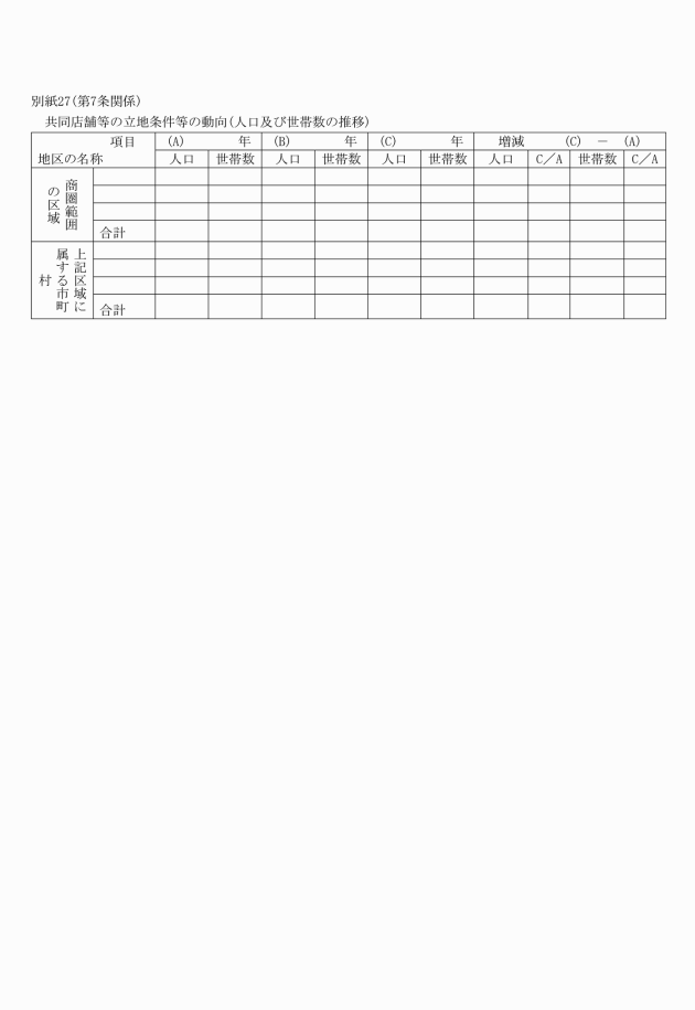 (2) 共同店舗等の立地条件等の動向(「人口及び世帯数の推移(別紙27)」、「立地する市町村及び隣接する市町村の小売商業活動の推移(別紙28)」、「住宅団地、工場誘致その他行政計画等の現状とその進捗状況(別紙29)」、「競合すると思われる店舗の状況(別紙30)」)