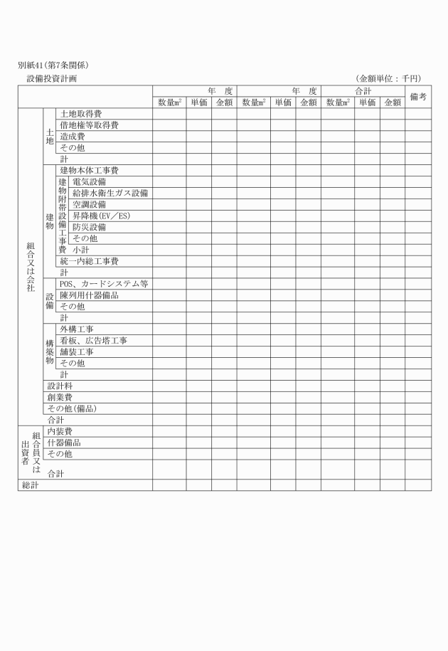 (2) 設置する施設又は設備の種類、構造及び規模(「一般公衆の利便に供する施設の概要(別紙48)(「施設の種類別の具体的内容又は特徴」及び「施設の種類別の運営方法及び利用計画」を記載すること。)」、「その他の施設の概要(別紙49)(「施設の種類別の具体的内容又は特徴」及び「施設の種類別の運営方法及び利用計画」を記載すること。)」、「一般公衆の利便に供する設備の種類、数量及び金額(別紙50)」、「その他の設備の種類、数量及び金額(別紙51)」、「一般公衆の利便に供する構築物の種類、数量及び金額(別紙52)」、「その他の構築物の種類、数量及び金額(別紙53)」及び「共同店舗を設置する場合にあっては、当該共同店舗の構造、規模及び建設費」)