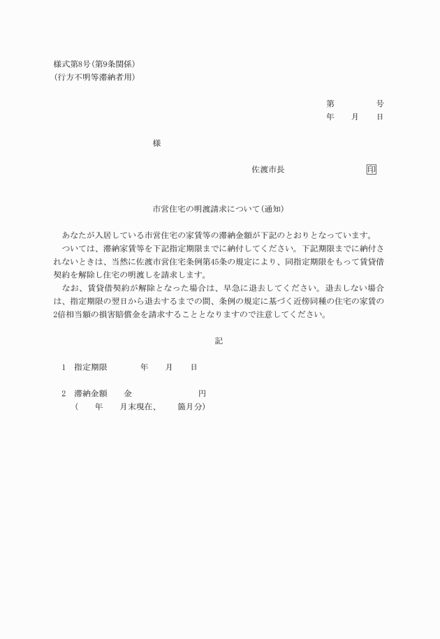 第3条 市長は、家賃等の納付期限を過ぎたにもかかわらず、当該家賃等を納付しない入居者に対し、佐渡市督促手数料及び延滞金徴収条例(平成16年佐渡市条例第69号)第2条の規定により督促状を発する。
