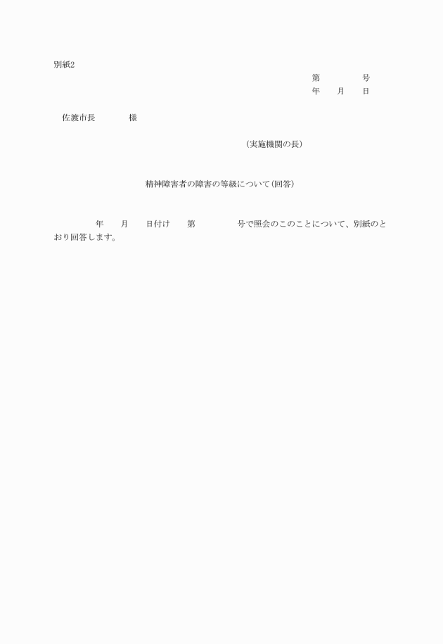 2 市長は、前項の申請を受けた場合、自立支援医療費(精神通院医療)の支給認定は新潟県佐渡保健所長が行うことから、精神保健センター所長へ自立支援医療費(精神通院医療)の同時申請である旨を通知するとともに申請書に診断書の原本を添付し判定依頼を行い、新潟県佐渡保健所には手帳の同時申請である旨を通知するとともに申請書に診断書の写しを添付し進達する。この場合において、市長は精神保健センター所長に対し、新潟県佐渡保健所にも判定結果を通知するよう依頼するものとする。