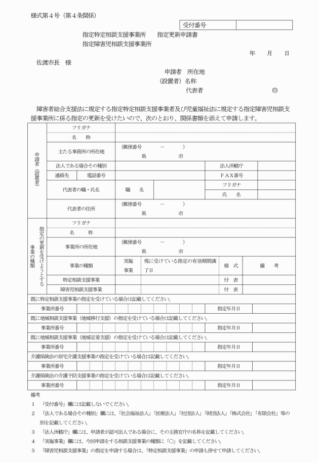 第4条 障害者総合支援法第51条の21第2項において準用する障害者総合支援法第51条の20第1項の申請又は児童福祉法第24条の29第4項において準用する児童福祉法第24条の28第1項の申請は、指定更新申請書(様式第4号)に市長が別に定める書類を添付して行うものとする。