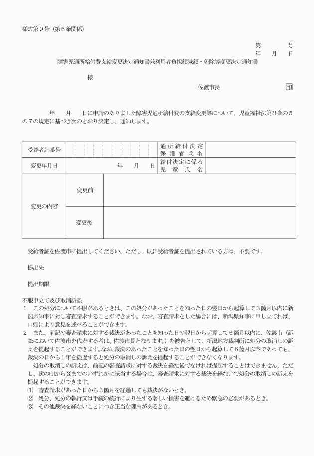 第5条 法第21条の5の8第1項に規定する支給決定の変更の申請は、障害児通所給付費支給変更申請書兼利用者負担額減額・免除等変更申請書(様式第8号)によるものとする。