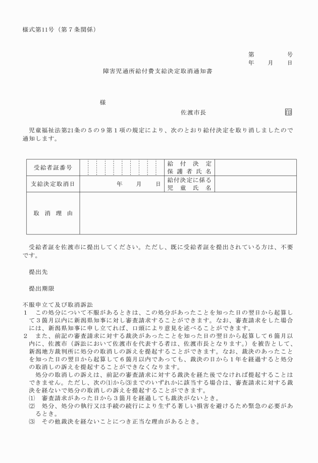 第7条 法第21条の5の9第1項の規定による通所給付決定の取消しの通知は、障害児通所給付費支給決定取消通知書(様式第11号)により行うものとする。