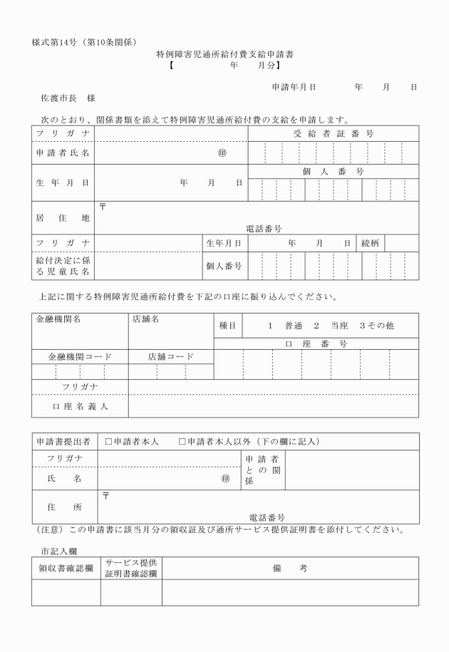 第10条 法第21条の5の4第1項に規定する特例障害児通所給付費の支給の申請は、特例障害児通所給付費支給申請書(様式第14号)によるものとする。