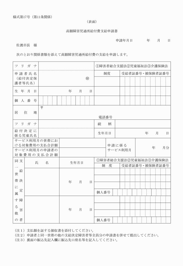 第11条 法第21条の5の12第1項の高額障害児通所給付費の支給の申請は、高額障害児通所給付費支給申請書(様式第17号)によるものとする。