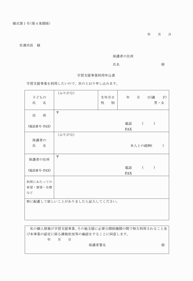 第4条 事業の利用を希望する対象者世帯の保護者は、市長に学習支援事業利用申込書(様式第1号)により申込まなければならない。