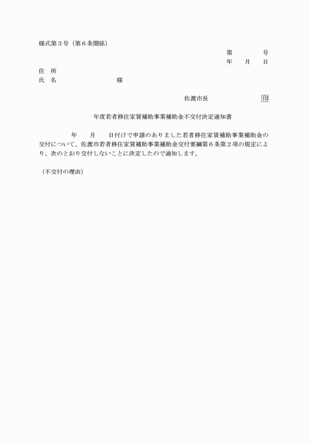 2 市長は、審査の結果、補助金を交付しないと認めるときは、その理由を付して若者移住家賃補助事業補助金不交付決定通知書(様式第3号)により、申請者に通知する。