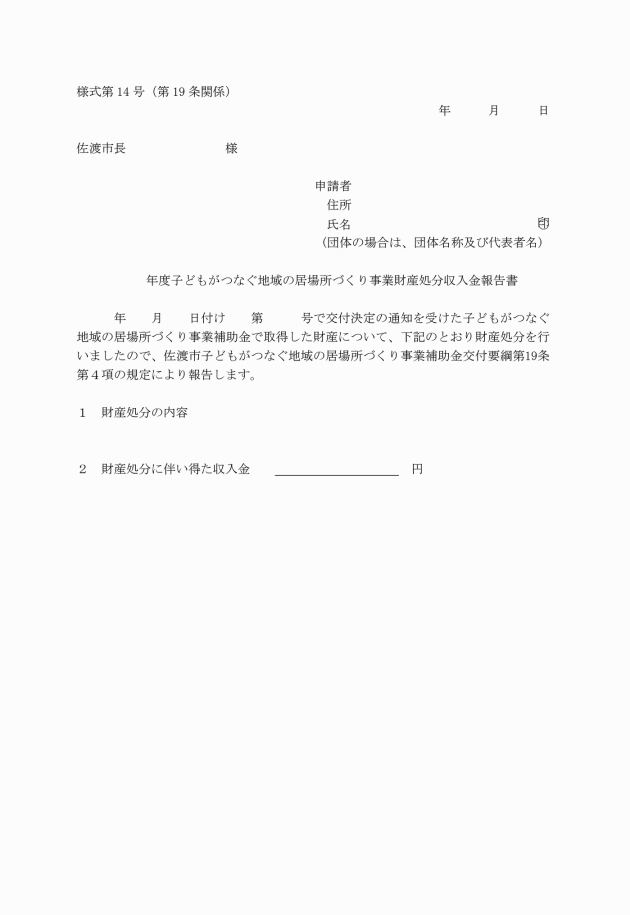 4 補助事業者は、取得財産等を処分することにより、収入があったときは、子どもがつなぐ地域の居場所づくり事業財産処分収入金報告書(様式第14号)を市長に提出し、市の請求に応じその収入の一部を市に納付しなければならない。