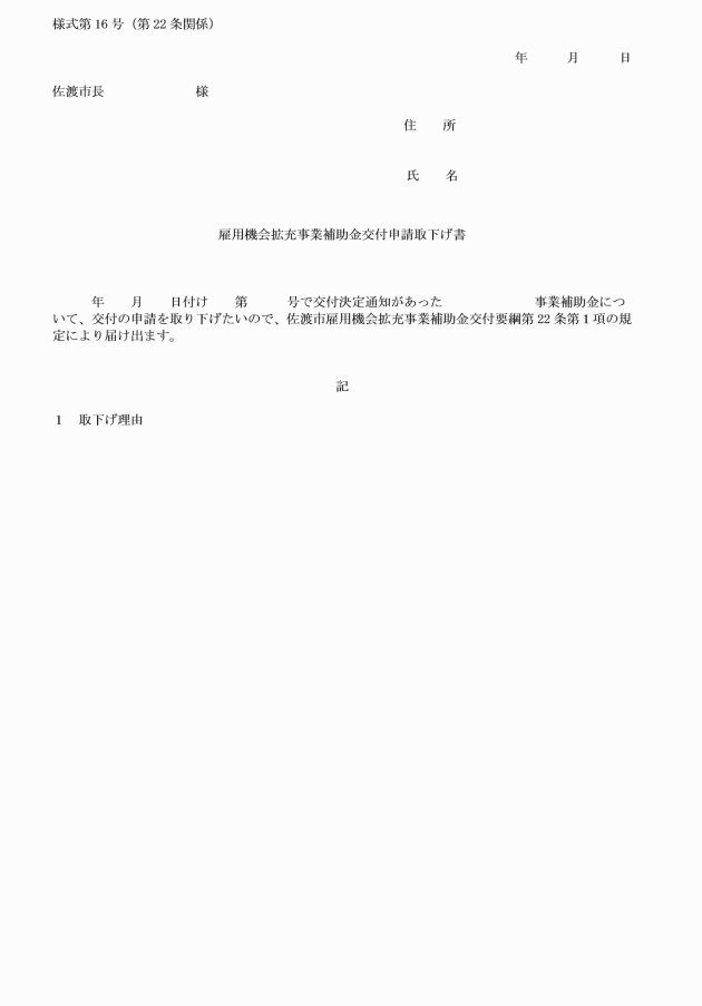 第22条 補助事業者は、補助金の交付決定の通知を受けた場合において、交付の決定の内容又はこれに付された条件に対して不服があり、補助金の交付の申請を取り下げようとするときは、当該通知を受けた日から10日以内に、雇用機会拡充事業補助金交付申請取下げ書(様式第16号)により市長に申し出なければならない。