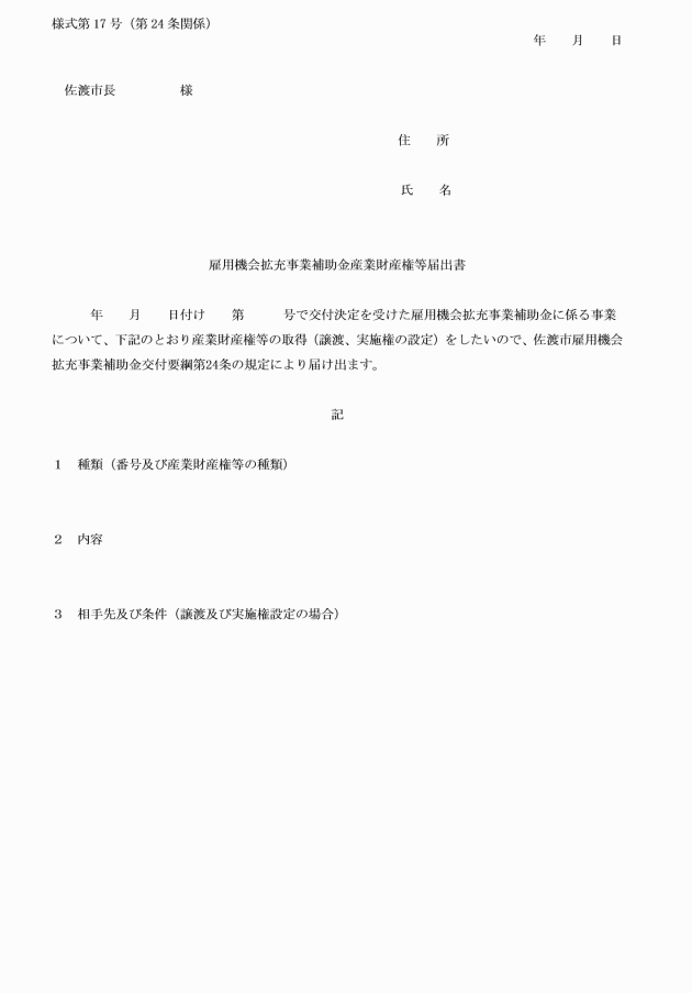 第24条 補助事業者は、補助事業に基づく発明、考案等に関して、特許権、実用新案権又は意匠権(以下「産業財産権等」という。)を取得した場合、又はこれらを譲渡し、若しくは実施権を設定した場合には、速やかに雇用機会拡充事業補助金産業財産権等届出書(様式第17号)を市長に提出しなければならない。