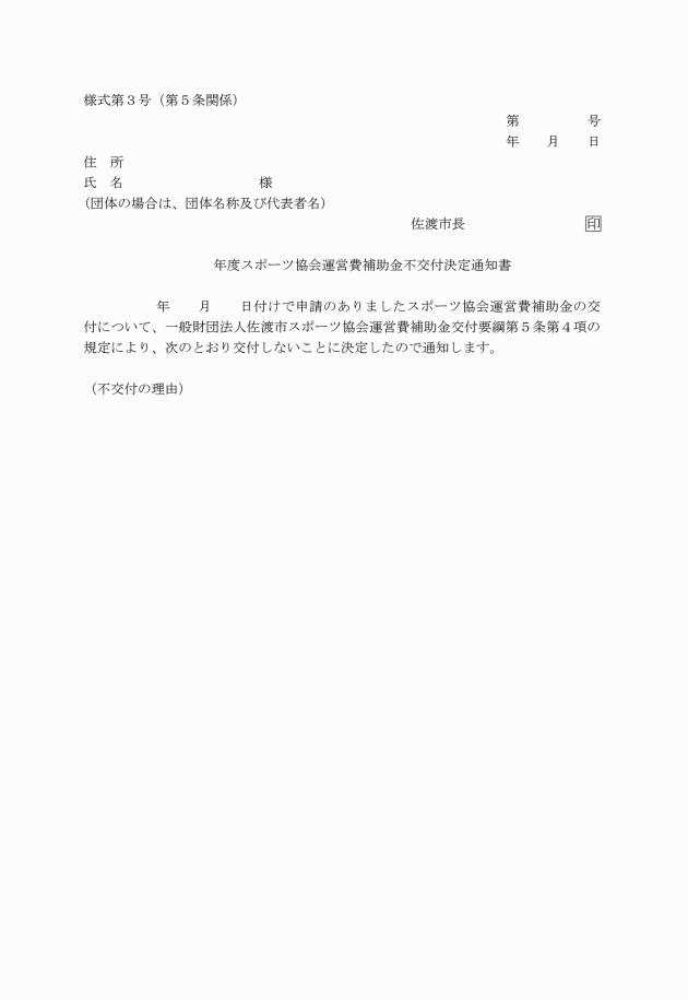4 市長は、審査の結果、補助金を交付しないと認めるときは、その理由を付してスポーツ協会運営費補助金不交付決定通知書(様式第3号)により、申請者に通知する。