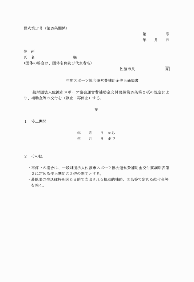第12条 市長は、補助事業者がその責めに帰さない事由により補助事業の全部又は一部を中止し、又は廃止しようとするときは、補助事業者からスポーツ協会運営費補助金中止(廃止)承認申請書(様式第12号)を提出させ、これを審査し、中止又は廃止がやむを得ないと認めてこれを承認したときは、当該補助事業者に通知する。