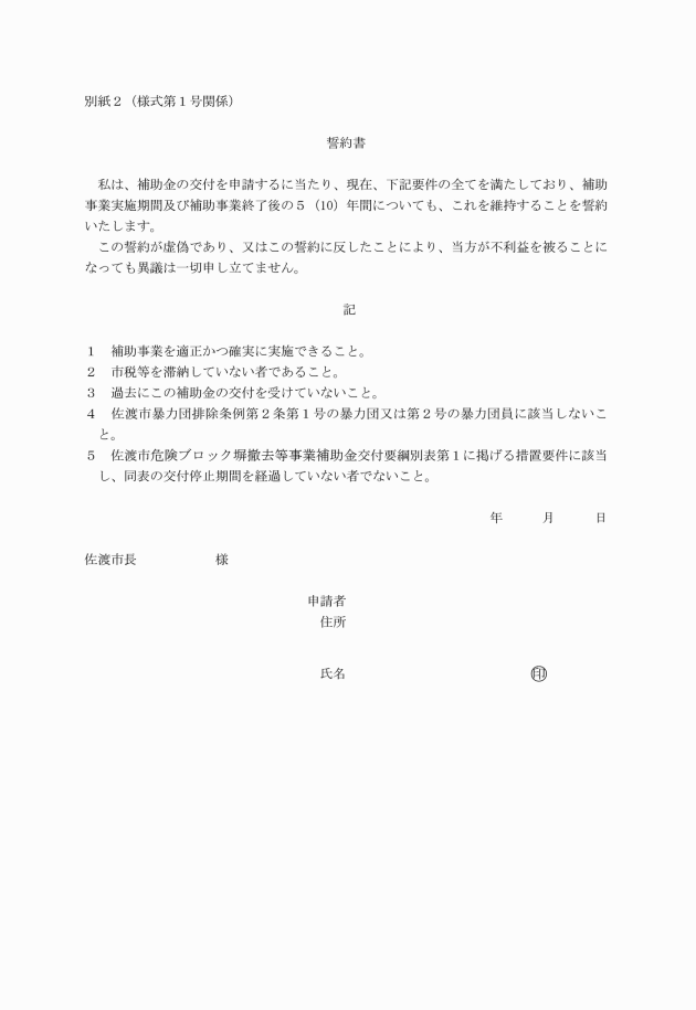 第6条 補助事業者は、補助金の交付申請を行う場合においては、補助対象工事を行う前に、危険ブロック塀撤去等事業補助金交付申請書(様式第1号)に添付書類を添えて、市長に提出しなければならない。