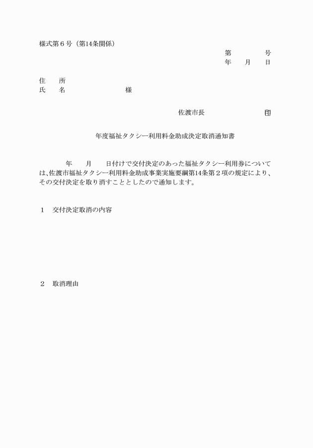 第5条 タクシー料金の助成を受けようとする者は、福祉タクシー利用券交付申請書(様式第1号)により市長に申請しなければならない。