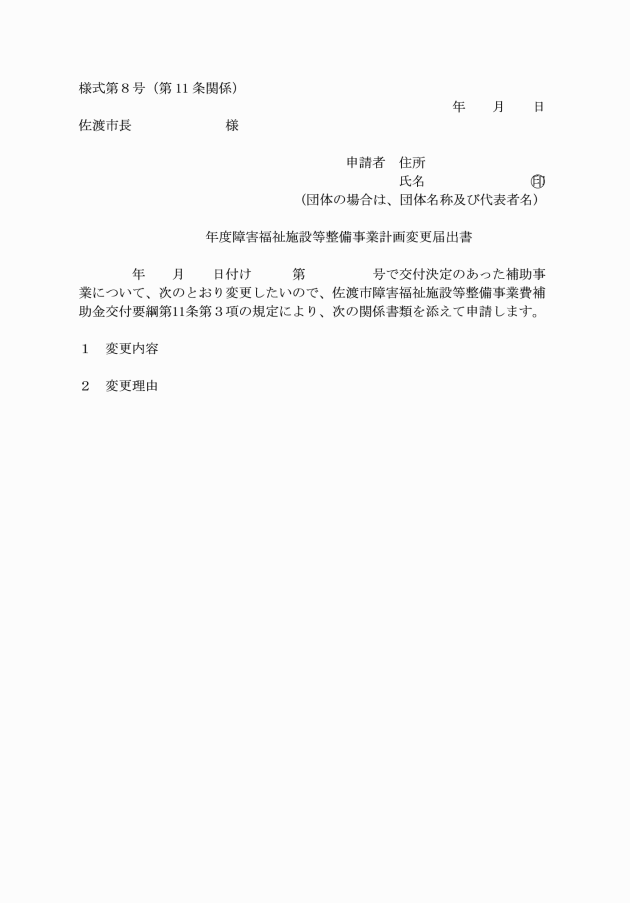 3 補助事業者は、第1項各号のいずれにも該当しない軽微な変更及び第8条第2号ただし書の規定に該当する場合は、障害福祉施設等整備事業計画変更届出書(様式第8号)を市長に提出するものとする。