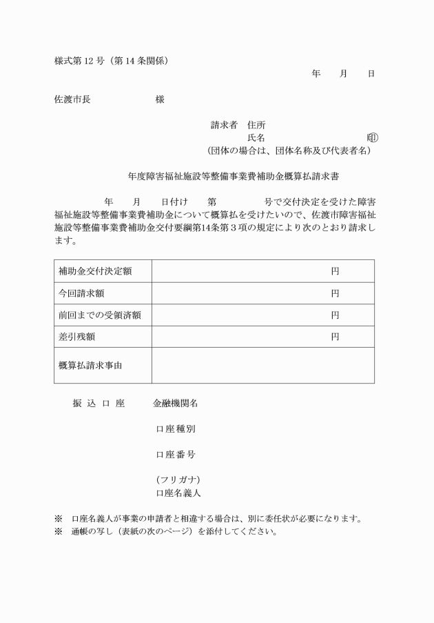 第12条 補助事業者は、補助事業が完了したときは、当該補助事業の完了の日から起算して20日以内又は3月31日のいずれか早い日までに、障害福祉施設等整備事業実績報告書(様式第9号)に添付書類を添えて市長に報告しなければならない。