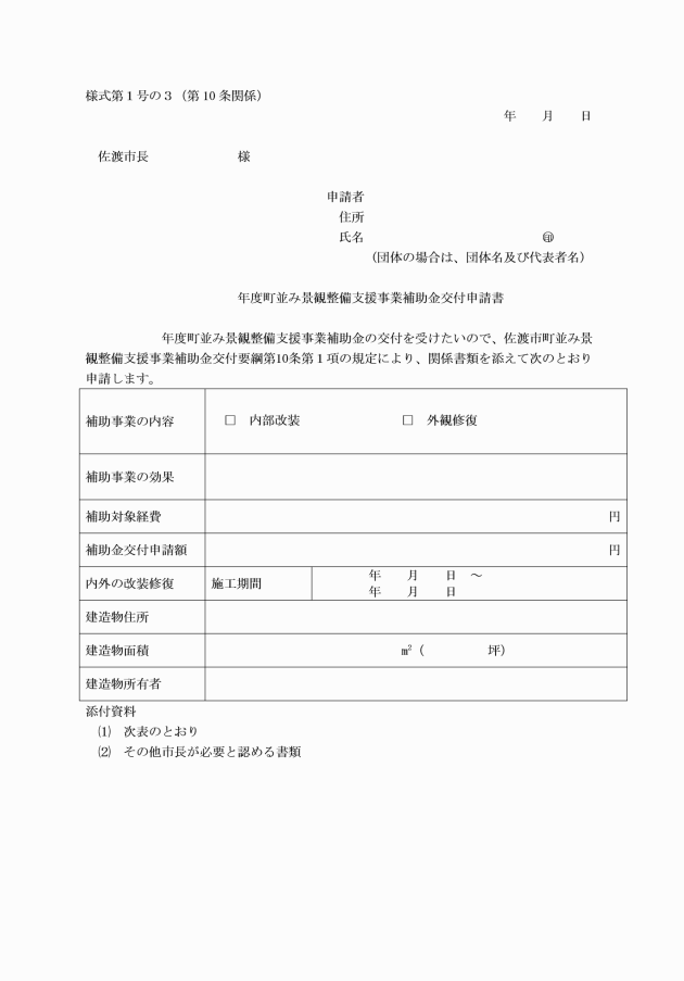 第10条 申請者は、町並み景観整備支援事業補助金交付申請書(様式第1号の3)に市長が定める書類(以下「添付書類」という。)を添えて、市長に提出しなければならない。