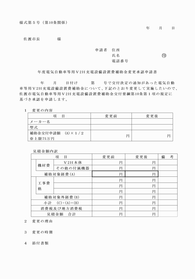 第10条 補助金の交付の決定を受けた者が、次に掲げる事業内容の変更をしようとするときは、あらかじめ電気自動車等用V2H充電設備設置費補助金変更承認申請書(様式第5号)により市長に申請し、その承認を受けなければならない。