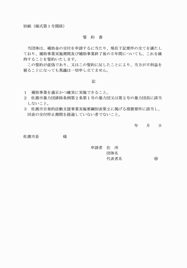 第6条 申請者は、自発的活動支援事業補助金交付申請書(様式第1号)に次に掲げる書類を添えて、市長に提出しなければならない。ただし、添付すべき書類については、市長がその必要がないと認めたときは、省略することができる。