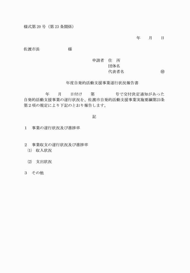 第12条 補助対象団体は、補助事業が完了したときは、当該補助事業の完了の日から起算して20日以内又は3月31日のいずれか早い日までに、自発的活動支援事業実績報告書(様式第9号)に次に掲げる添付書類を添えて市長に報告しなければならない。