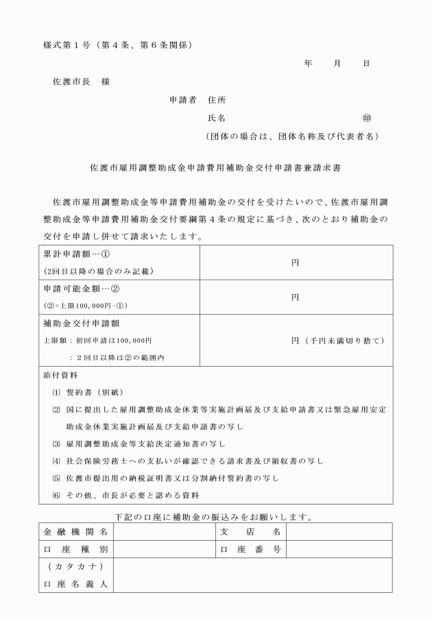 第4条 補助金の交付を受けようとする者は、国から雇用調整助成金等の支給決定を受けた翌日から起算して3月以内又は交付申請年度の3月31日のいずれか早い日までに佐渡市雇用調整助成金申請費用補助金交付申請書兼請求書(様式第1号)に必要な書類を添付して、市長に提出しなければならない。