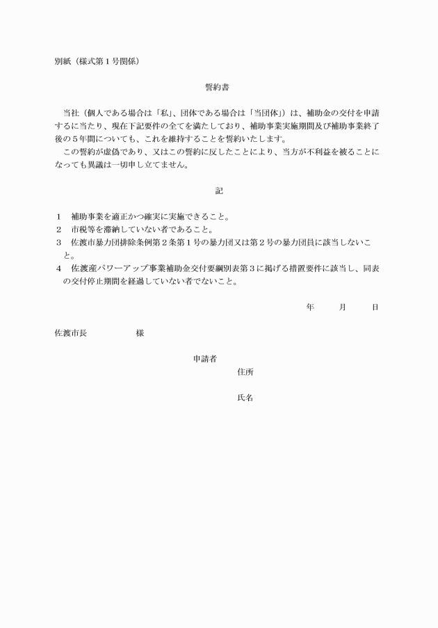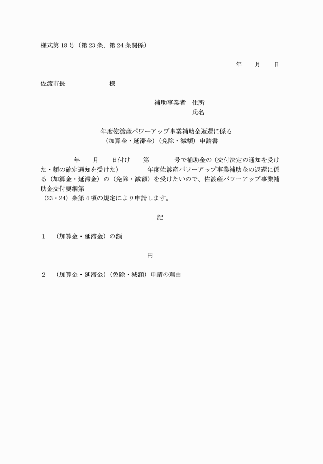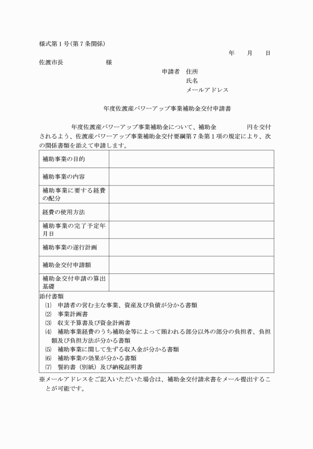 第7条 申請者は、佐渡産パワーアップ事業補助金交付申請書(様式第1号)に市長が定める書類(以下「添付書類」という。)を添えて、市長に提出しなければならない。