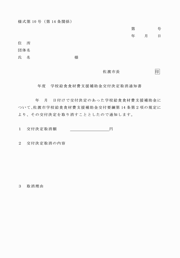 3 市長は、審査の結果、補助金を交付することが適当でないと認めたときは、学校給食食材費支援補助金不交付決定通知書(様式第3号)により、受任者に通知する。