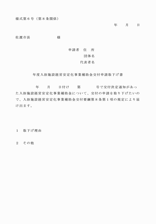 第12条 市長は、補助事業者がその責めに帰さない事由により補助事業の全部又は一部を中止し、若しくは廃止しようとするときは、補助事業者から入浴施設経営安定化事業補助金事業中止(廃止)承認申請書(様式第10号)を提出させ、これを審査し、中止又は廃止がやむを得ないと認めてこれを承認したときは、当該補助事業者に通知する。