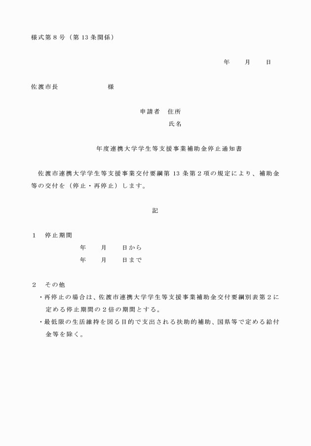 第7条 補助事業者は、補助金の交付決定の通知を受けた場合において、交付の決定の内容又はこれに付された条件に対して不服があり、補助金の交付の申請を取り下げようとするときは、当該通知を受けた日から14日以内に、連携大学学生等支援事業補助金交付申請取下げ書(様式第4号)により市長に申し出なければならない。