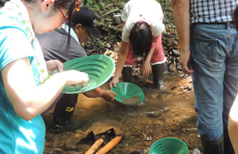 住民グループ「笹川の景観を守る会」の案内のもと、島内の小学生とその保護者7人が参加し、西三川砂金山跡の見学や自然の河川での砂金採り体験を行いました。