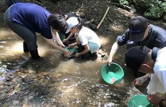 当日は2班に分かれ、地元の「笹川の景観を守る会」の方々のガイドにより、砂金採取の歴史を学びました。また、集落内の河川での砂金採り体験も行い、かつて砂金採りに使用していた道具類に触れながら、楽しい時間を過ごしていました。